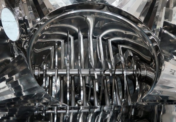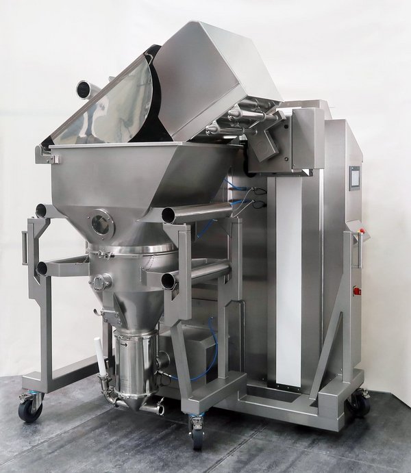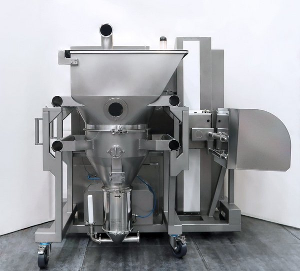 Die Baugruppen sind schnell demontierbar; für die vollständige Demontage von Einlauftrichter und Zerhacker wird eine Hubsäule genutzt. So bleiben kurze Rüstzeiten, hohe GMP-Konformität und ein zuverlässiger, reproduzierbarer Prozess gewährleistet.