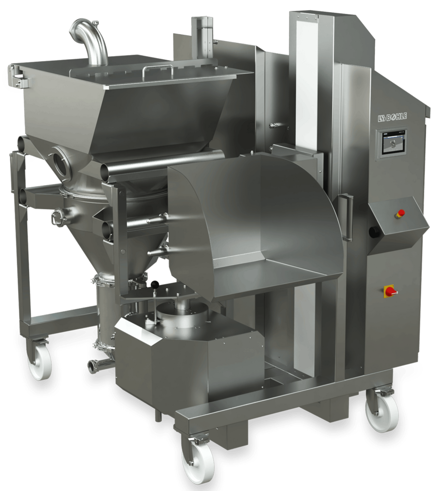 Die Metformin-Aufbereitungsstation ist eine mobile, kompakte Einheit zur effizienten Aufbereitung von Metformin-Blöcken: Klumpenbrecher und Bohle-Turbo-Sieb (BTS) zerkleinern und sieben das Produkt; anschließend wird es per Vakuum direkt in die angrenzende Wirbelschichtanlage (BFS) transferiert.