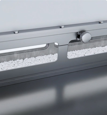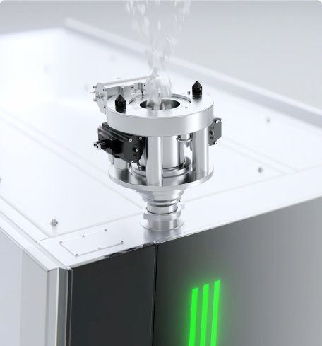 Ein integrierter Vibrator/Klopfer sorgt für einen gleichmäßigen Produktfluss und verhindert Anhaftungen. Zudem gewährleistet die direkte Absaugung am Einfülltrichter einen staubarmen, sauberen Betrieb.