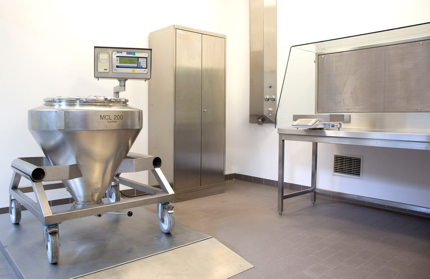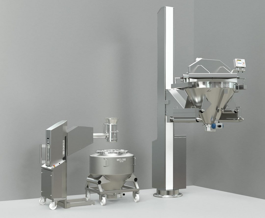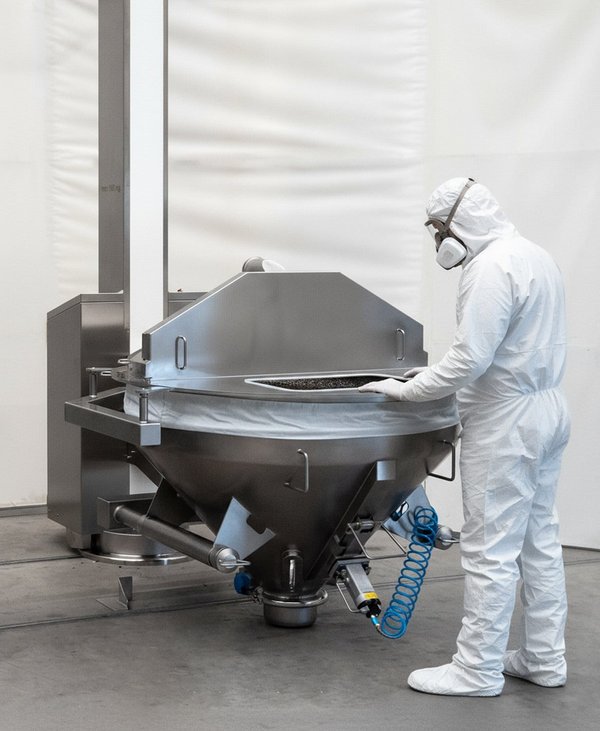 Durch ein Ein-Ebenen-Konzept entfallen Plattformen, Bühnen und Deckendurchbrüche. Die Rohstoffe werden unkompliziert ebenerdig transportiert und verarbeitet und über einen hydraulisch angehobenen Wiegetrichter staubfrei in den IBC entleert. Dank des durchdachten Designs entfällt der Einsatz von In- oder Aufflurwaagen ebenso wie der kostenintensive und aufwendige Einbau von Laminar-Flow-Kabinen oder zusätzlichen Brandschutzmaßnahmen.