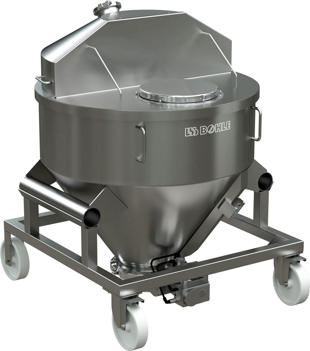 Der Wiegetrichter BWT besteht aus einem Containerkörper mit konischen Auslauf und der Auslaufklappe. Für das Behälterhandling sind am Trichter zwei Passrohre angeschweißt. Abgestellt und transportiert wird der BWT auf einem Fahrgestell, das zum Lieferumfang gehört. Das Fahrgestell verfügt über Bock- und Lenkrollen mit Feststellbremse.