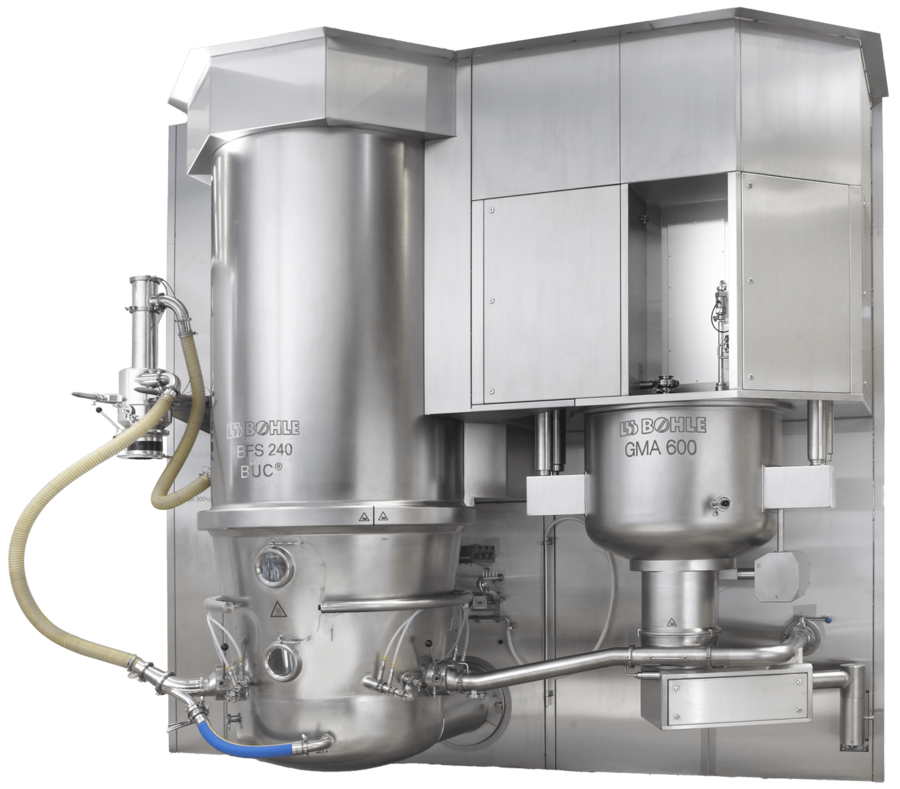 Das kompakte Granulationsmodul lässt durch die direkt nebeneinander angeordneten Komponenten eine besonders platzsparende Installation zu. Ergänzend dazu ist ein direkter Produkttransfer vom Auslassventil des GMA über eine Edelstahlrohrleitung zum Einsaugventil des BFS möglich.