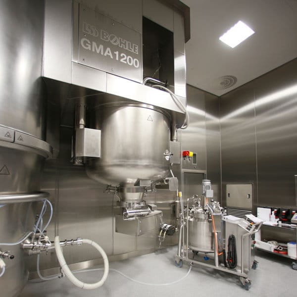 Der High-Shear Granulierer GMA ist eine speziell für pharmazeutische Anwendungen optimierte Granulationsanlage und für den Wandeinbau konzipiert. Das Herzstück der Granulierer GMA stellt der zylindrische Prozessbehälter mit doppelt gewölbtem Boden dar. Die Behälterform sorgt im Zusammenspiel mit der Rührflügelgeometrie für eine effektive Granulation.